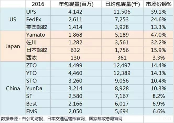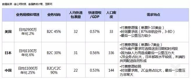 这个议题让我们再来对比下美国/日本/中国快递市场。