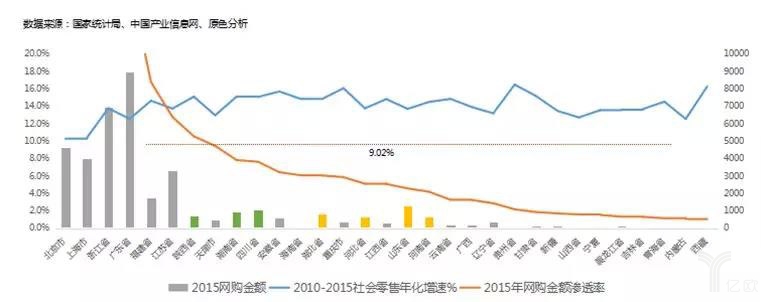 在选择覆盖时,除了必须覆盖的一些核心区域,也可以重点选择一些到件量区域潜力较大的。下图是各省市网购金额、社会零售年化增速、网购金额渗透率的图表,如果进一步细化到区县,应该可以帮助我们判断出快递潜力。