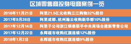 在步步高之前,浙江省最大的连锁超市三江购物已于2016年11月就投身阿里,此后被誉为福建省最大商业企业的新华都也于去年9月被划入阿里阵营。而成都连锁商业巨头红旗连锁,因先后两次向永辉超市出售股份,且腾讯作为永辉超市第二大股东,因此被划入“京腾”阵营。在区域零售商与电商巨头双方诉求的联合推动下,零售业进入线上线下资源整合的加速期。