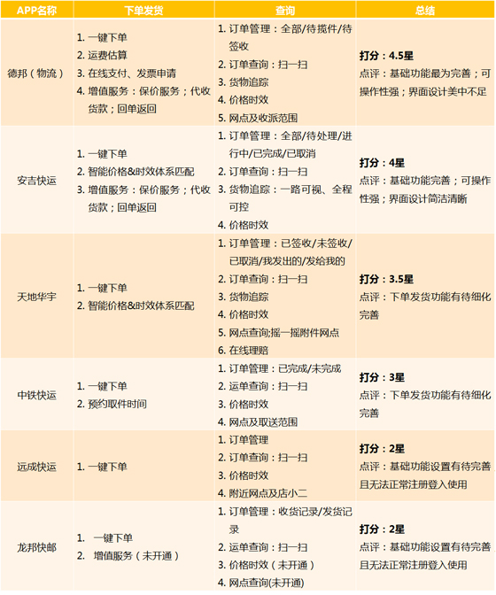 在安吉快运与2016年度国内零担收入排行榜前10大快运企业的快运APP对比调查中,我们发现:德邦与安吉快运为第一梯队;天地华宇与中铁物流为第二梯队;远成快运与龙邦快运为第三梯队;剩下没有推出自己快运APP的快运企业,为第四梯队。