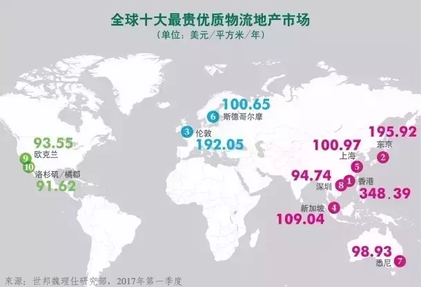 香港物流地产供不应求,仓库租金水涨船高,2016上半年暴涨30%-50%。在全球十大最贵优质物流地产排名中,香港蝉联榜首。香港市场的优质物流地产年租金达311.52美元/平米,以贵出逾七成的绝对优势碾压第二名东京180.2美元。