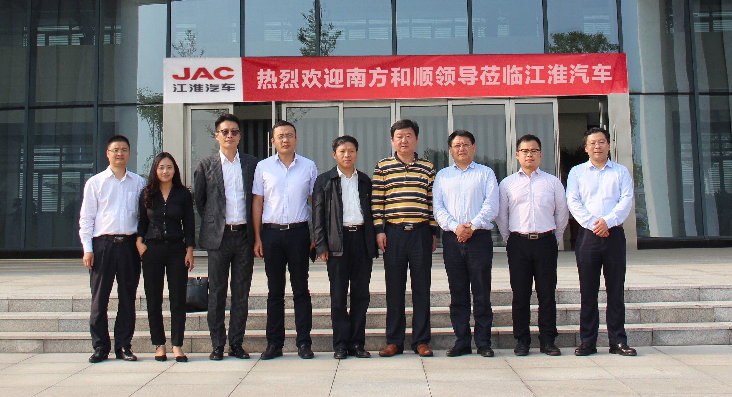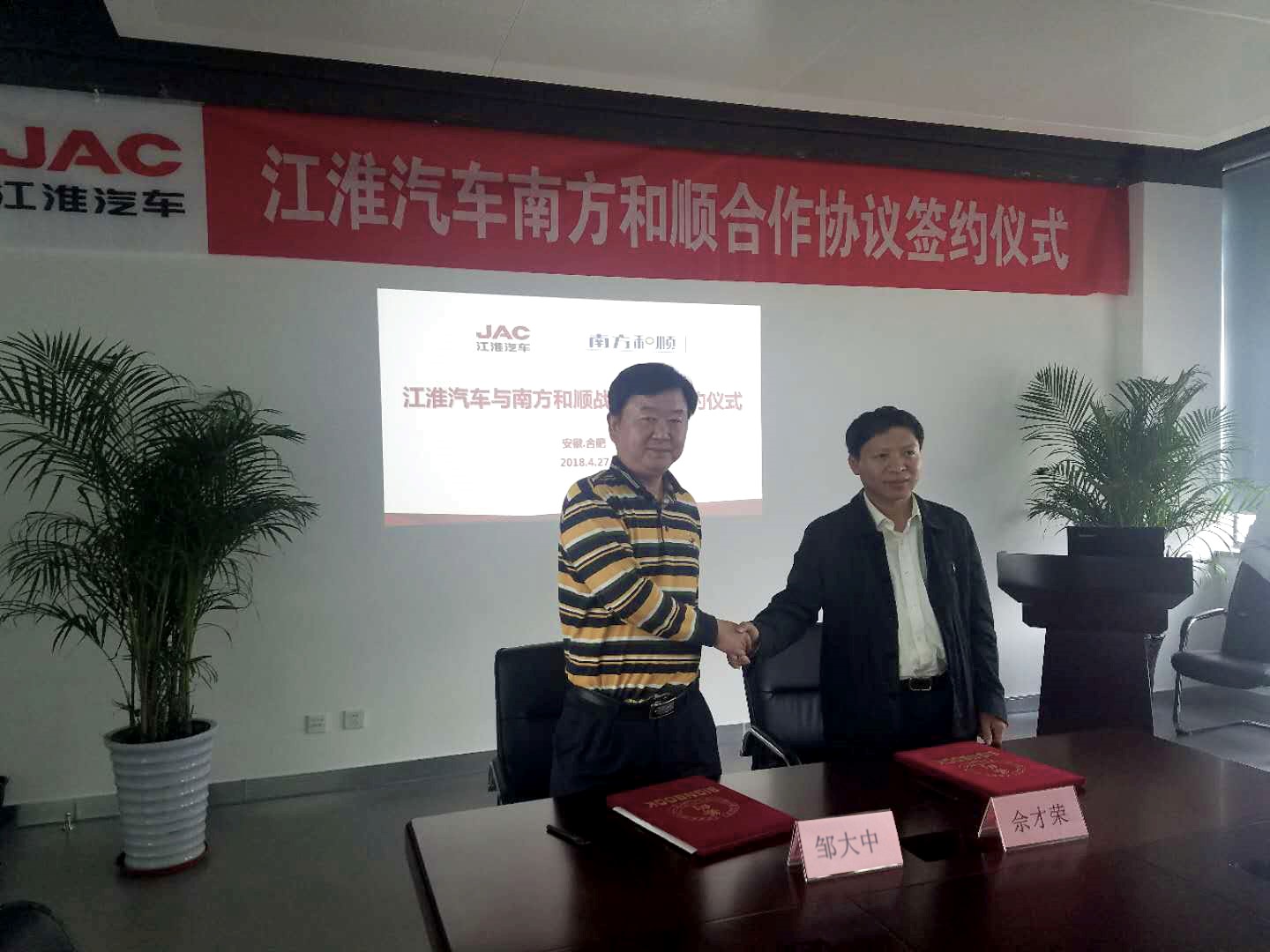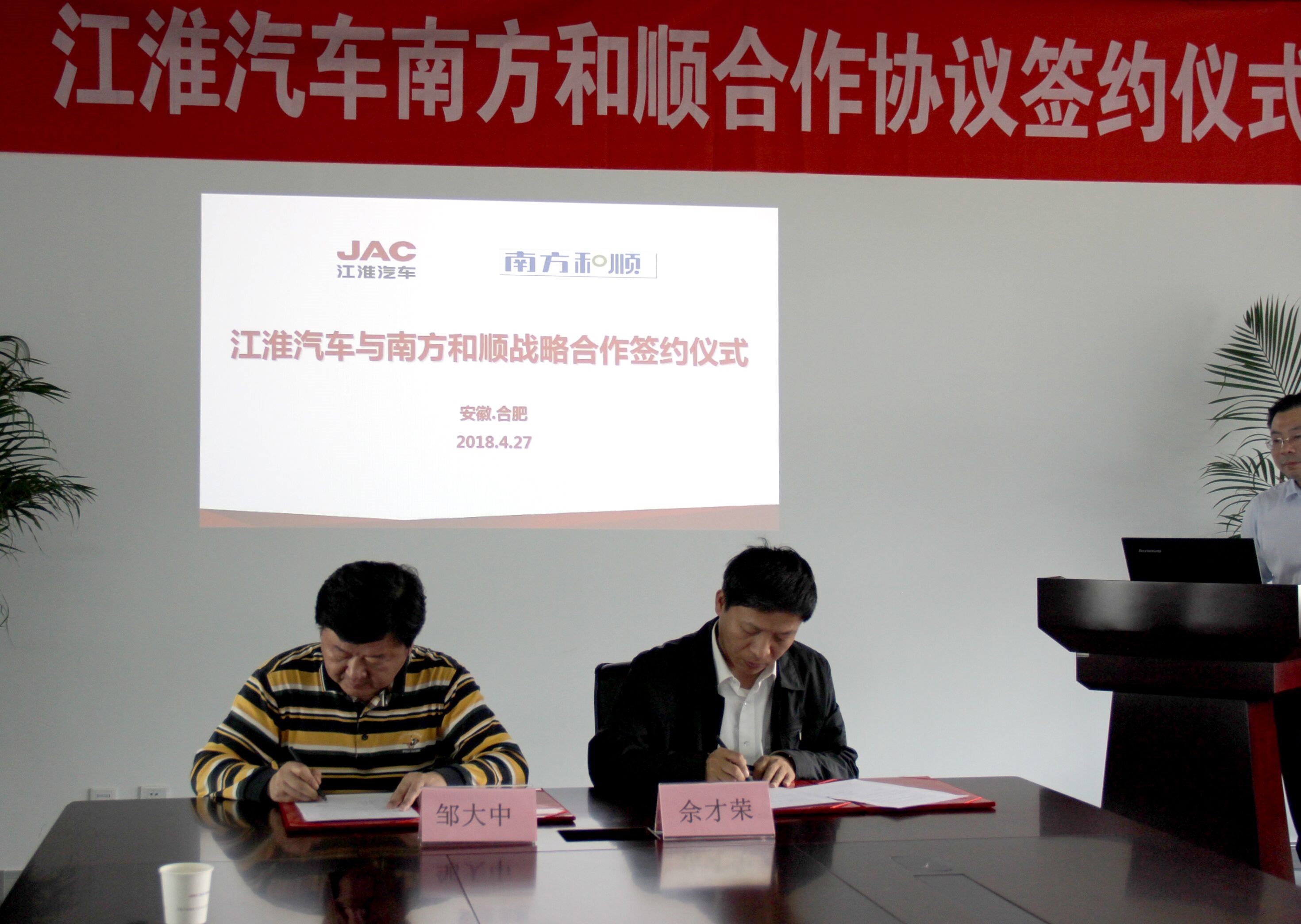 4月27日,安徽江淮汽车集团与南方电网旗下深圳南方和顺电动汽车产业服务有限公司在安徽江淮新港基地正式签署战略合作协议,江淮汽车副总经理佘才荣与南方和顺公司总经理邹大中等出席了签约仪式并进行了座谈交流。
