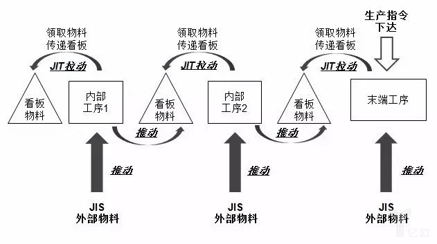 事实上,在丰田还同时存在着另外一种拉动模式,即“JIS”和“E-看板”配合模式,JIS-Just in Sequence,即顺序供应生产方式。它是根据车辆的生产计划,得到虚拟的车辆生产顺序,由此来预测未来各个工序车辆部件的使用顺序和时间,并由此指导部件厂的顺序供应。由于是基于虚拟的生产顺序生成的拉动信号,因此这种看板信号被称之为E-看板。