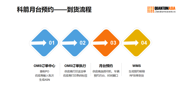 科箭软件近期推出基于其Power SCM Cloud供应链云平台上跨多个产品线(WMS仓储管理云、TMS运输管理云、OMS订单管理云)的“预约管理”功能,使供应商、承运商/司机可提前进行收货或发货仓的时间及月台预约,仓库管理者可以清楚地看到时间窗、月台的使用状态,轻松规划仓库作业、车辆进场离场时间。 以到货预约为例,预约流程只需以下四大步骤:
