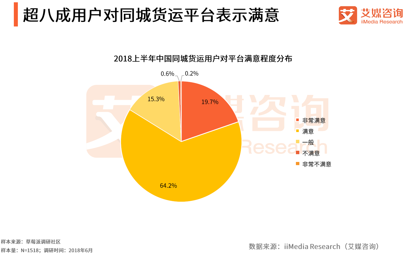 2018年6月29日,全球领先的新经济行业数据挖掘和分析机构iiMedia Research(艾媒咨询)权威发布《 2018上半年中国货运物流行业研究报告》。数据显示,受访同城货运用户对于平台服务满意度极高,其中19.7%的受访用户表示非常满意,64.2%的受访用户表示满意。