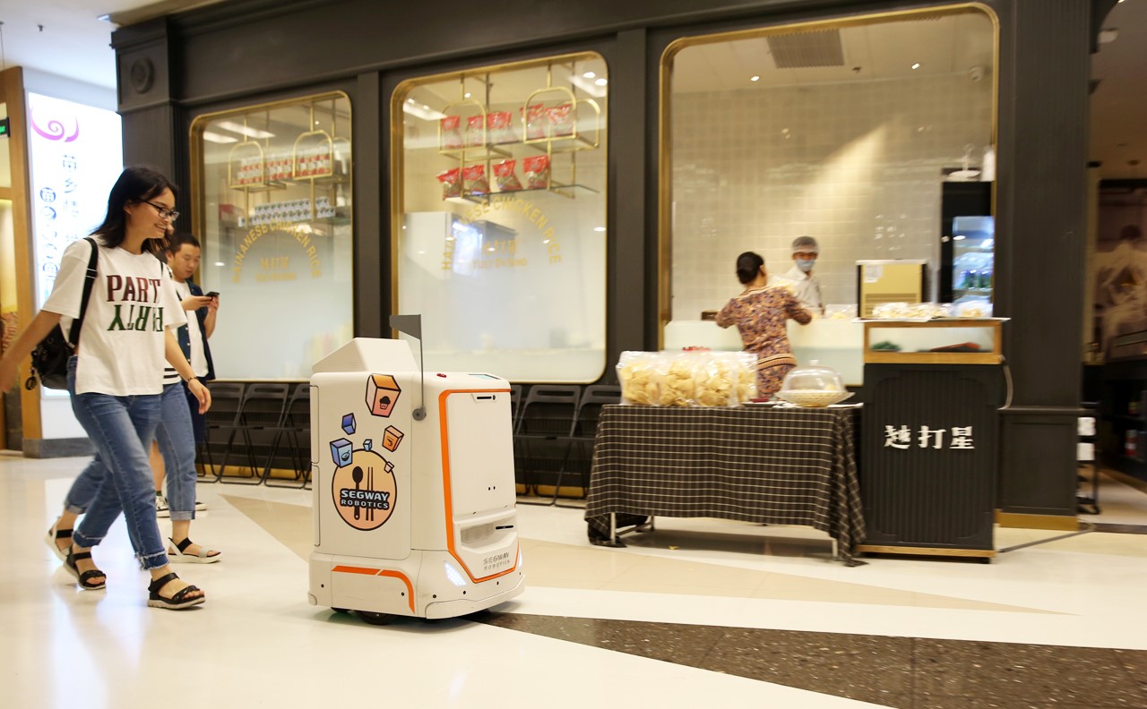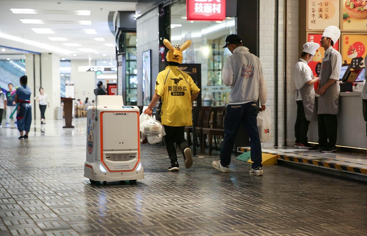 近日,在北京朝阳大悦城逛街的人发现一辆印着Segway Robotics和美团标志的的配送机器人在商场内不时穿梭,所到之处吸引路人频频驻足观望。配送机器人到达商场门口时,美团外卖小哥就从机器人“肚子”里取出客户预定的餐食,然后绝尘而去。