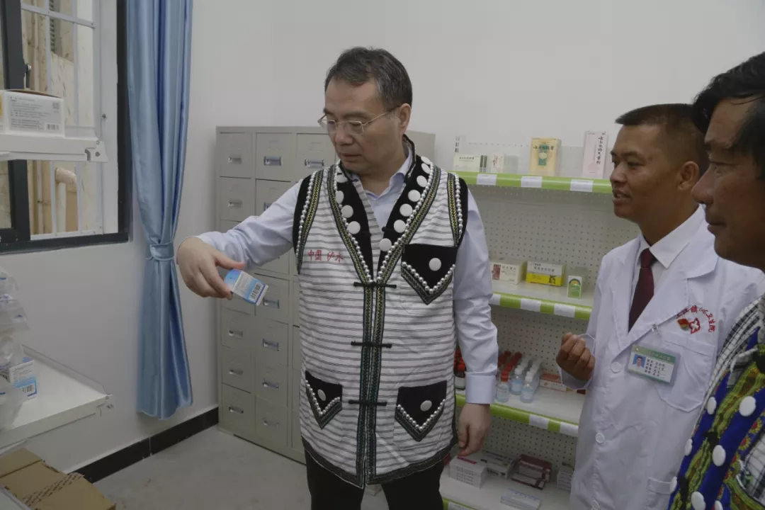 徐冠巨身着当地村民赠送的民族服装与村民、村医在安心卫生室交流