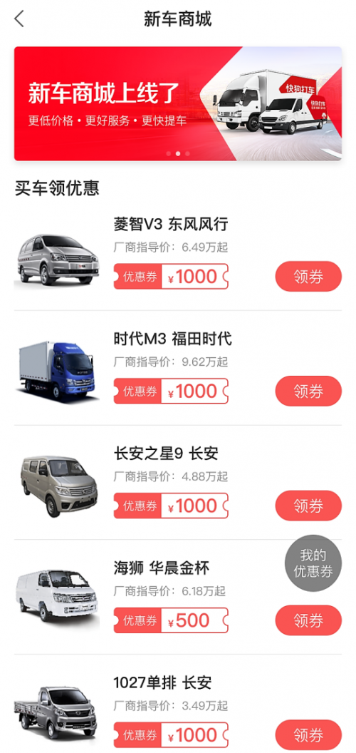 同时,为了更好的服务广大司机和货主,为客户创造更多的价值,快狗打车平台在最新版的车主端App隆重推出了“新车商城”,购买合作车企的指定车辆,可享受“超低价+优惠券”的超值福利,标志着快狗打车平台重磅切入合作购车业务。
