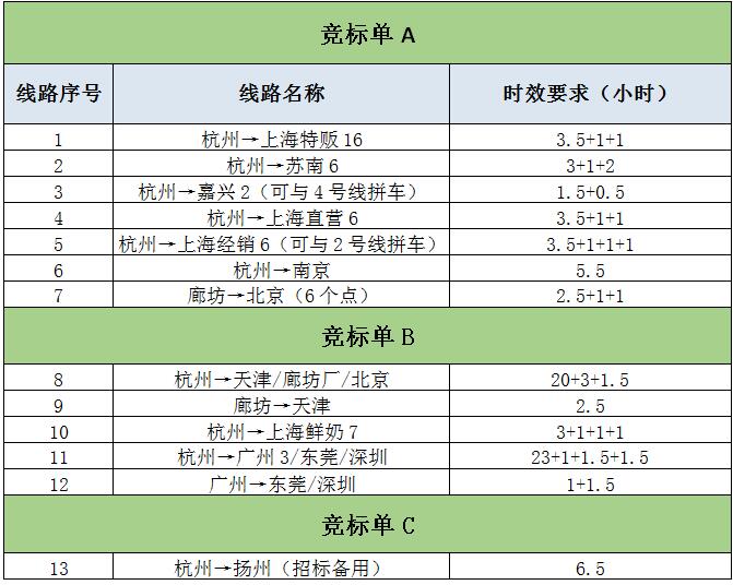 注:时效要求:指车辆从离厂到第一家客户、再到下一家客户的在途耗时;多点下货须按味全要求拼车。