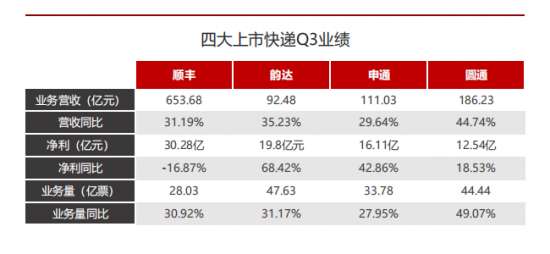 四大上市快递Q3业绩