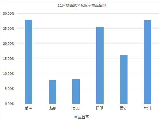 全国30个城市仓库平均空置率为10.43%,环比下降0.18%,其中,华西地区仓库空置率要显著高于其他四个大区。相较10月,华南、华北地区仓库空置率有小幅上涨,华东、华中、华西地区仓库空置率有小幅下降。