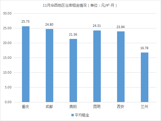 全国30个城市仓库平均租金为26.99元/㎡·月,环比上涨0.37%,其中,华南、华东地区仓库平均租金略高于华北、华中、华西地区。相较10月,华南、华中地区仓库平均租金小幅下降,华东、华北、华西地区仓库平均租金小幅上涨。