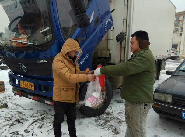 【欧马可外出救援时为客户送上热水、方面面等暖心食品】