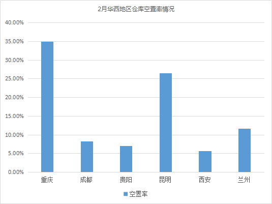仓库空置率最高的城市为重庆、南昌、昆明,空置率均超26%。相较1月,南昌、昆明仓库空置率波动不大;重庆延续供大于求趋势,仓库空置率有小幅上涨,涨幅约0.60%。