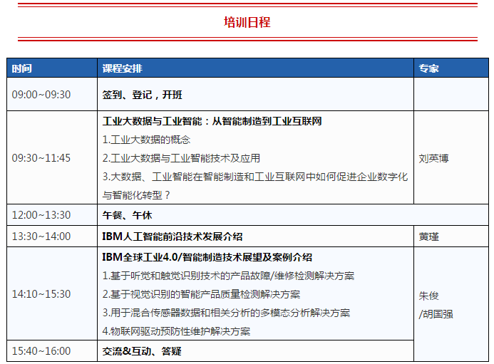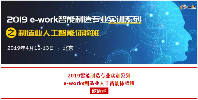 为了帮助更多企业了解人工智能技术及其在企业的应用,e-works数字化企业网拟定于2019年4月12-13日在北京市举办《2019 e-work智能制造专业实训系列:制造业人工智能体验班》。体验班将邀请清华大学软件学院刘英博博士、IBM公司人工智能专家授课。体验班还将参观国际机器公司(IBM)北京客户创新中心,李开复旗下创新工场、创新奇智,现场体验人工智能技术成果及应用场景。