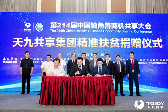 2019年6月14日,第214届中国独角兽商机共享大会暨天九共享集团精准扶贫捐赠仪式在湖北宜昌隆重举行。近600位工商联领导、商协会领导以及企业家到场参会,共同探讨在新经济环境下如何助力企业家智慧转型,推动民营经济向高质量发展。