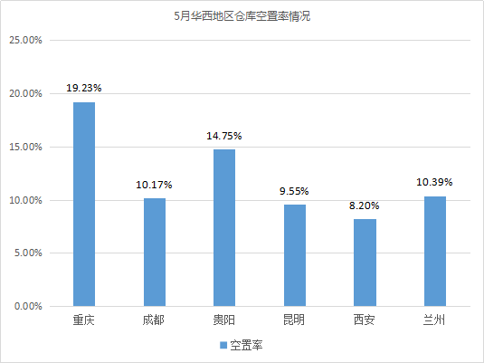 仓库空置率最高的城市为重庆、深圳,均超过17%。相较4月,重庆因618电商节临近,电商租仓备货增多,仓库需求有所增加,导致仓库空置率有小幅下降,降幅为2.26%;从供应方面来看,未来三个月,重庆将有10.24万㎡仓库投入入市,如九江大道丙二类仓库(7月建成)、江津区新建产业园高台库(8月建成);从需求方面来看,据重庆统计局数据显示,1-4月,支柱产业中,汽车产值下降17.3%,汽车制造业降速明显,未来汽车配套服务企业仓储需求疲软,仓库空置率或将回升。
