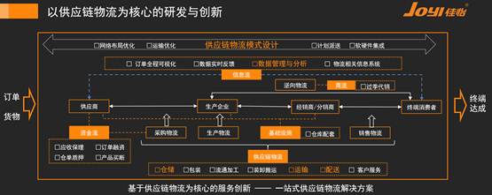 在供应链物流方面,佳怡目前涉及到采购物流、生产物流、销售物流以及逆向物流四个核心环节,同时所能提供的物流服务涵盖仓、运、配、流动加工、包装等等一系列的活动环节。而基于最基础的也是最核心的供应链物流,佳怡还延伸出了资金流、商流、信息流以及基础设施。要知道,这些环节不是独立存在的,也不能在一开始就搭好一个万能的框架,做出产品推给客户,而是要在提供供应链物流的服务过程中,不断根据客户需求去完善以及研发配套服务。