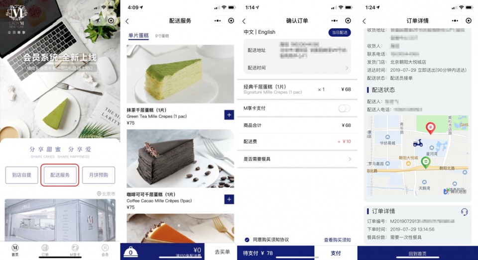 惊喜和好奇环伺,笔者忍不住亲自体验了Lady M的外卖服务,整个流程简洁易操作,当日即收到了选购的蛋糕,且和在实体门店内的商品没有任何区别,而承接Lady M外卖服务的正是顺丰同城急送。