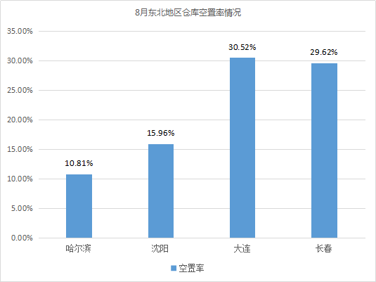 仓库空置率最高的城市为大连、南昌、长春,平均在30%左右。相较7月,南昌仓库空置率波动不大;大连因新建仓库投入市场(丰树自贸区物流园7.19万㎡等),仓库空置率有所上升,升幅为3.83%;长春因长期处于供大于求状态,且本月部分仓库因合同到期退租,市场消化有限,导致仓库空置率有所上升,升幅为2.92%。
