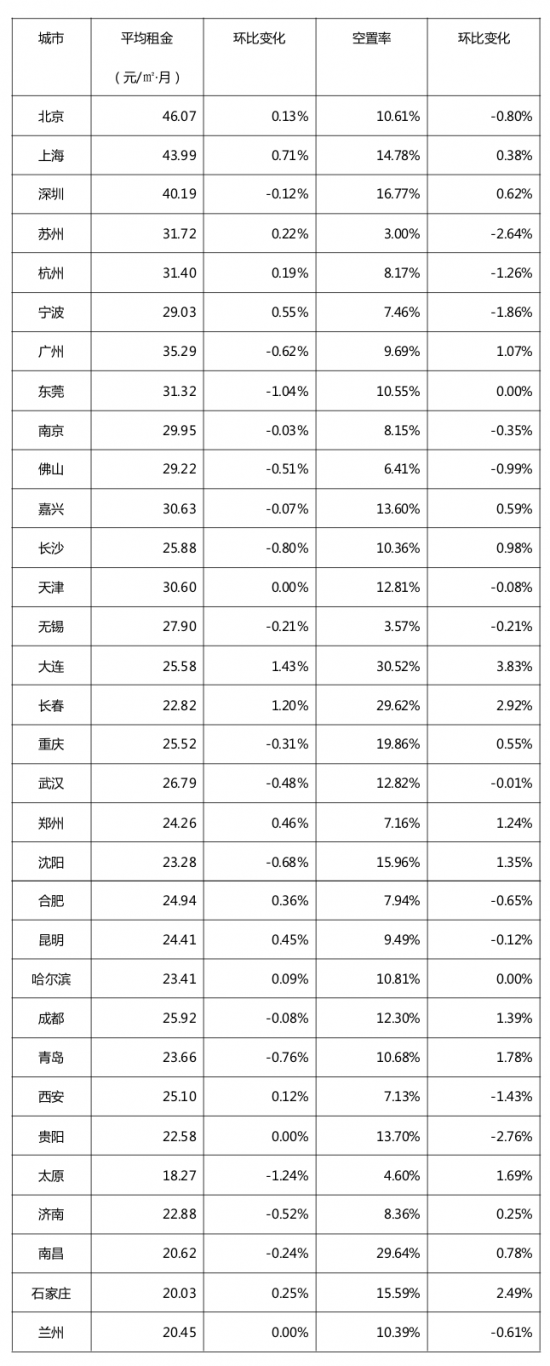 仓库空置率最低的城市为苏州、无锡、太原,均低于5%。相较7月,无锡仓库空置率波动不大;苏州多数企业为“双11”备货做准备,仓库需求增加,导致仓库空置率有所下降,降幅为2.64%;太原因阳曲康产业园区33万㎡医药仓库投入市场,仓库空置率有小幅上升,升幅为1.69%。