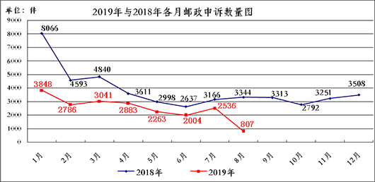8月,邮政业消费者对邮政服务问题申诉807件,环比下降68.2%,同比下降75.9%。