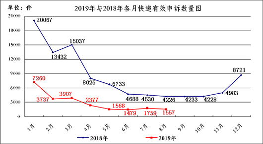 2019年8月,国家邮政局和各省(区、市)邮政管理局通过“12305”邮政行业消费者申诉电话和申诉网站共处理消费者申诉55848件。申诉中涉及邮政服务问题的807件,占总申诉量的1.4%;涉及快递服务问题的55041件,占总申诉量的98.6%。