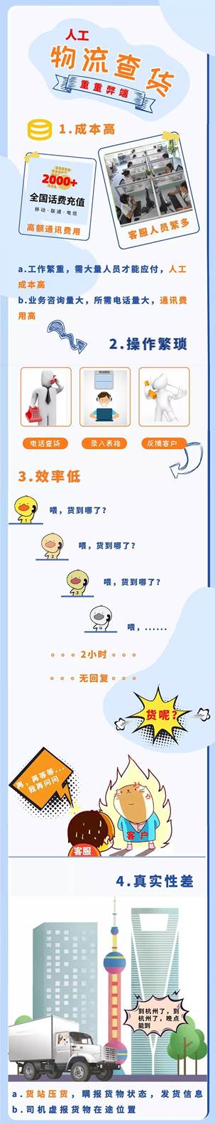 然而,即使是这样,也很难满足客户需求,有时候客户要查一笔货要好几个小时才能得到反馈,而且还不一定真实,严重影响客户服务体验,这种完全依靠人工的工作方式弊端显而易见。