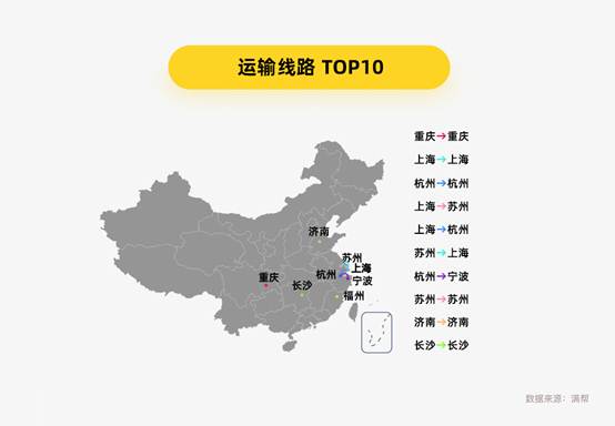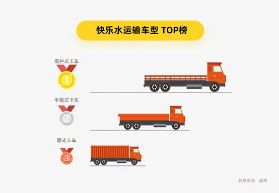 “快乐水”运输以短途为主,重庆、上海、杭州市内运输最活跃。满帮货运大数据显示,“快乐水”平均运输距离约434公里,平均货重18.2吨,多以高栏、平板、厢式货车为主,其中高栏车凭借装货多、捆绑少、局限小成为“天选”车型,承运次数是第二名平板货车的3倍多。