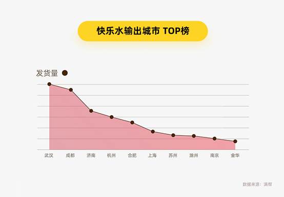 “快乐水”在哪里更受欢迎?数据显示,华东、中南地区为主要发出地,其中武汉、成都、济南、杭州、合肥位列“快乐水”输出城市前五强,仅武汉、成都两城运出的“快乐水”便承担了TOP10城市近一半的KPI!这与两地设有知名品牌“快乐水”工厂不无关系。