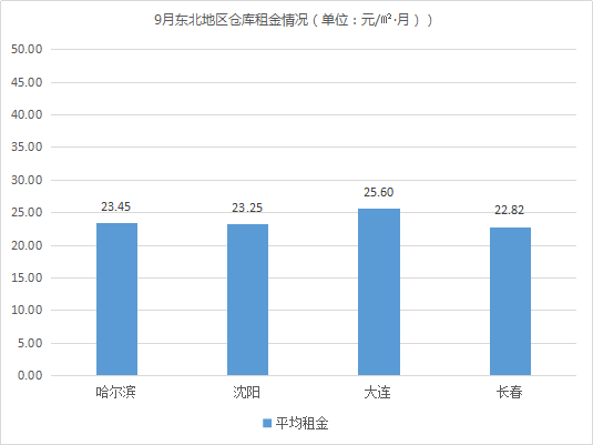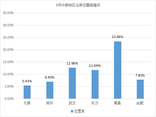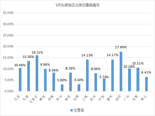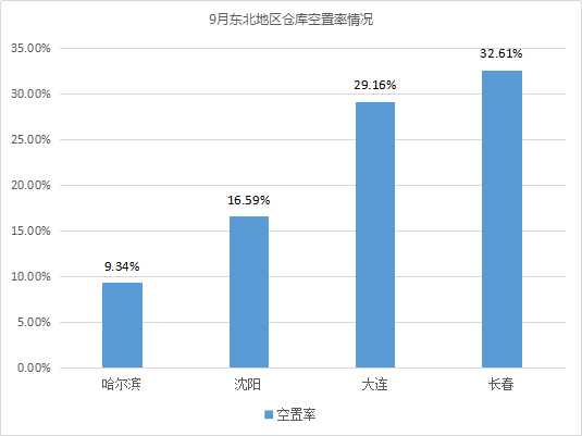 仓库空置率最高的城市为长春、大连,平均在30%左右。相较8月,长春延续上月仓库空置率上升趋势,空置率升幅约2.99%;大连因2019年“双11”电商节临近,快递快运企业业务流量增加,临时扩仓需求加大,导致仓库空置率有小幅下降,降幅为1.36%。