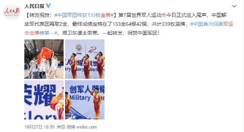 近日,第七届武汉军运会结束了为期十天的赛程,中国代表团狂揽133枚金牌,十天时间拿到的金牌数量已经超过往届任何一届的金牌总数。不得不说,“厉害了,我的国”。