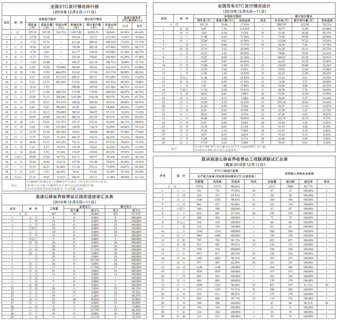 全国高速公路省界收费站正线改造总计划为487个。截至12月11日,累计完工454个,占总计划的93.22%。其中,本周完工49个,占总计划的10.06%。