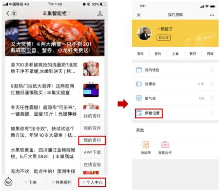 在“保管设置”中,可根据具体需求进行个性化定制:用户可以选择同意丰巢代保管包裹,也可以选择某个时段或者某家快递公司的包裹不入柜,更加人性化。设置方式:打开“丰巢智能柜”公众号,进入个人中心-我的资料-保管设置,根据需求进行设置。