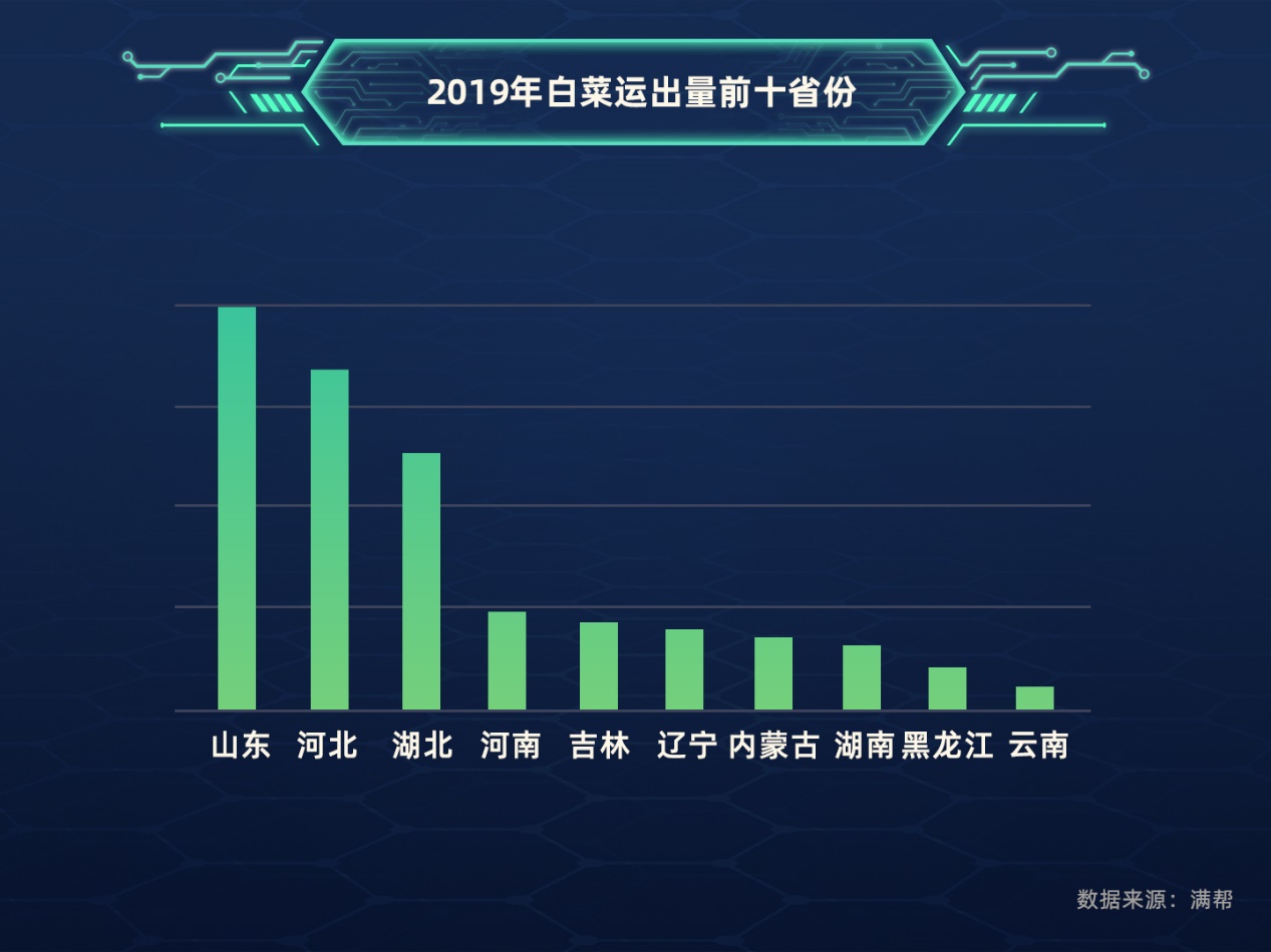 白菜主要输出区域以北方为主,山东、河北、吉林、湖北、河南都是白菜输出大省,其中,山东是绝对的主力。2019年,山东白菜输出量占到了全国总量的四分之一,输出量占比同比上涨了11%,同时,河北白菜输出量占比也呈现上升状态,从2018年的17.4%提升到21.6%,占比同比上涨24%。白菜供给跌幅明显的是吉林,2019年输出量占比狂跌到3.2%,占比同比下降了68%,从输出量前三省份跌到了第五。