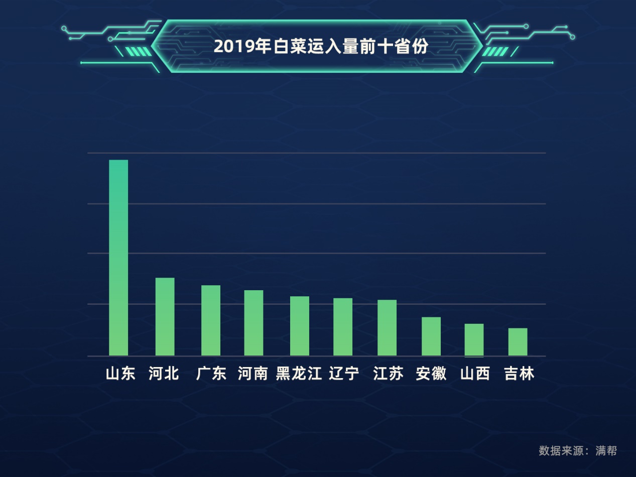 山东不仅是白菜最大的输出省份,也是最大的运入省份。2019年,山东白菜运入量占全国总量19.5%,居第一位。其他省份,如河北、河南、黑吉辽都是白菜产销两旺省份,而湖北属于产出多,但消耗少区域,广东则相反,消耗大,产出少。