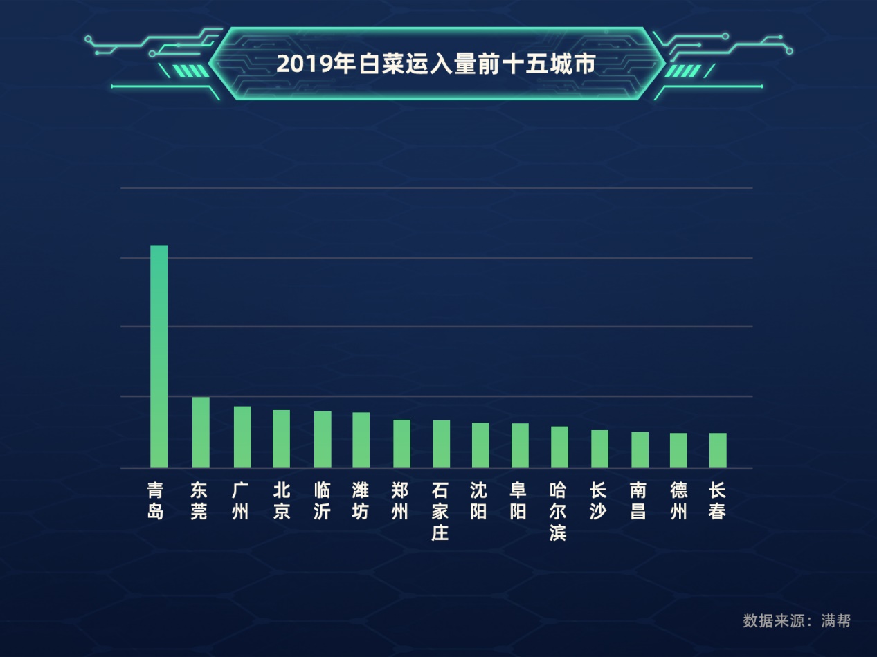 白菜单价低,以就近供给为主,张家口的白菜主要去了山东青岛、潍坊等蔬菜加工及批发基地,长春白菜去了青岛和沈阳,山东泰安白菜则去了石家庄和德州。北京是潍坊大白菜最大消耗城市,约5.3%潍坊大白菜供应了北京。东莞、广州等南方城市,则以武汉、咸宁、岳阳等中部供应地为主。