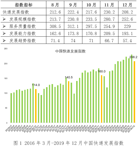 1月14日,国家邮政局发布2019年12月中国快递发展指数报告。据测算,2019年12月中国快递发展指数为208.2,同比提高30.1%,呈现稳中有进的态势。发展规模指数、服务质量指数和发展能力指数分别为252.6、229和193.1,比上年同期分别提高16.3%、62.8%和16.6%,我国快递市场保持良好发展态势。发展趋势指数为57.4,同比提高6.3%,增长预期高于上年同期。